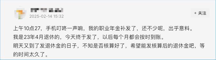 第三种就是机关事业单位退休中人获得的养老金或者职业年金补发,比如有网友表示自己是2023年2月份退休的,在今年2月份收到了补发的职业年金,出乎意料,如下图: