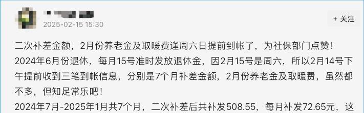 第一种就是当地完成2024年的养老金重算补发,比如河南就在2月份进行了重算补发,当地在去年1月份以来退休的人员,获得了养老金的二次核算,并且补发了养老金,导致2月份的养老金到账金额有明显增加,我们来看一位网友分享的信息,如下图: